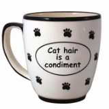Coffee mug is inscribed with "Cat Hair is a Condiment" and is also lead free, microwave, dishwasher, and oven safe. Great for gift giving as it already comes in a gift box.